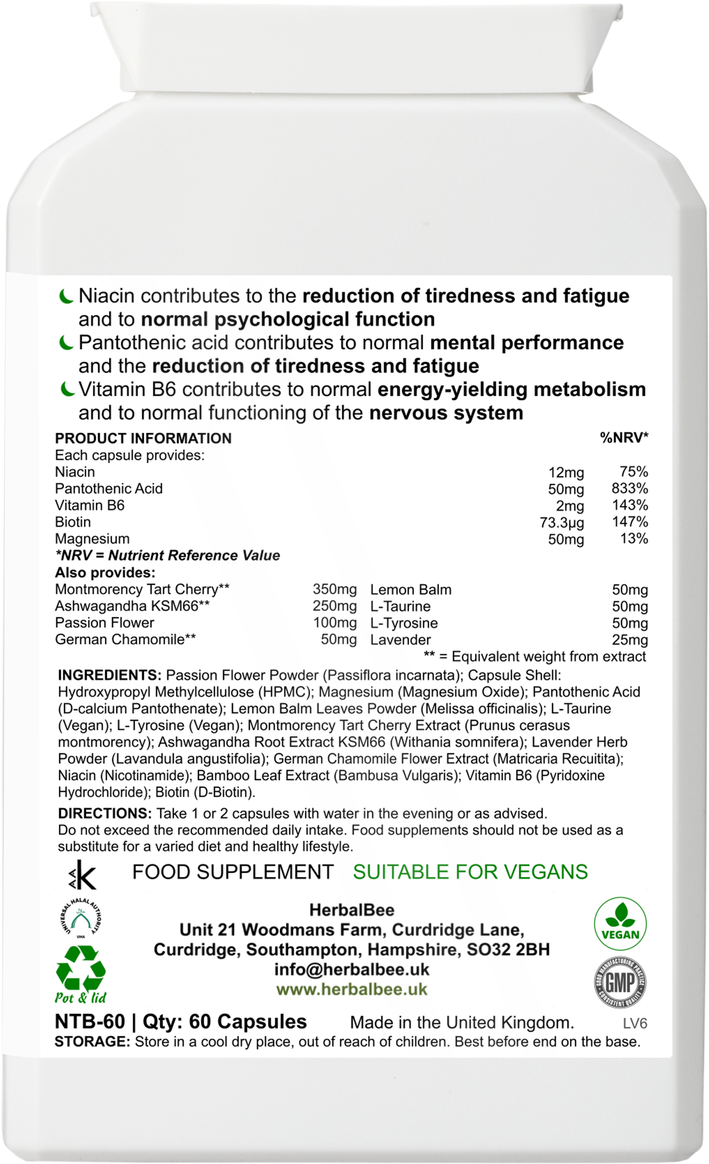 Passion Flower Powder, Capsule Shell: Hydroxypropyl Methylcellulose (HPMC), Magnesium (Magnesium Oxide), Pantothenic Acid (D-calcium Pantothenate), Lemon Balm Leaves Powder, L-Taurine (Vegan), L-Theanine (Vegan), Montmorency Tart Cherry Extract, Ashwagandha Root Extract KSM66, Lavender Herb Powder, German Chamomile Flower Extract, Niacin (Nicotinamide), Bamboo Leaf Extract, Vitamin B6 (Pyridoxine Hydrochloride), Biotin (D-Biotin).