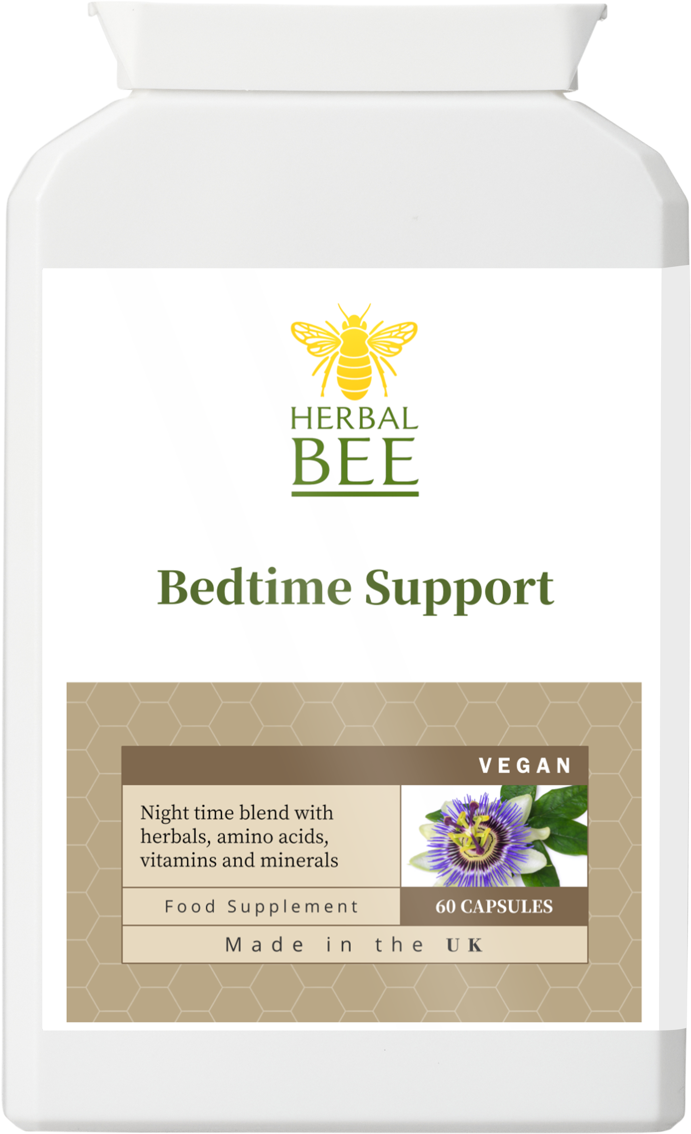 • Valerian root, 5-HTP, magnesium, chamomile & lemon balm