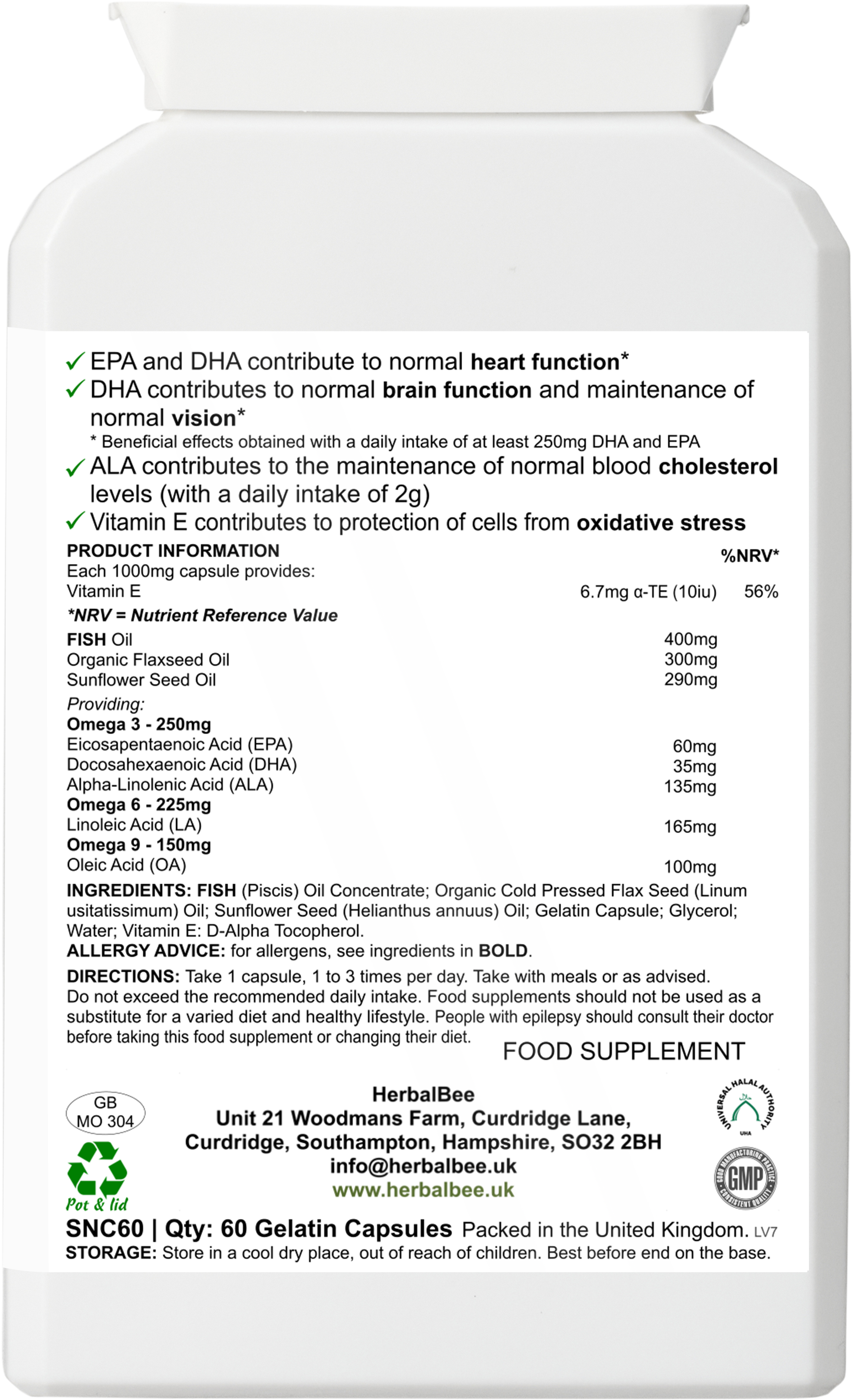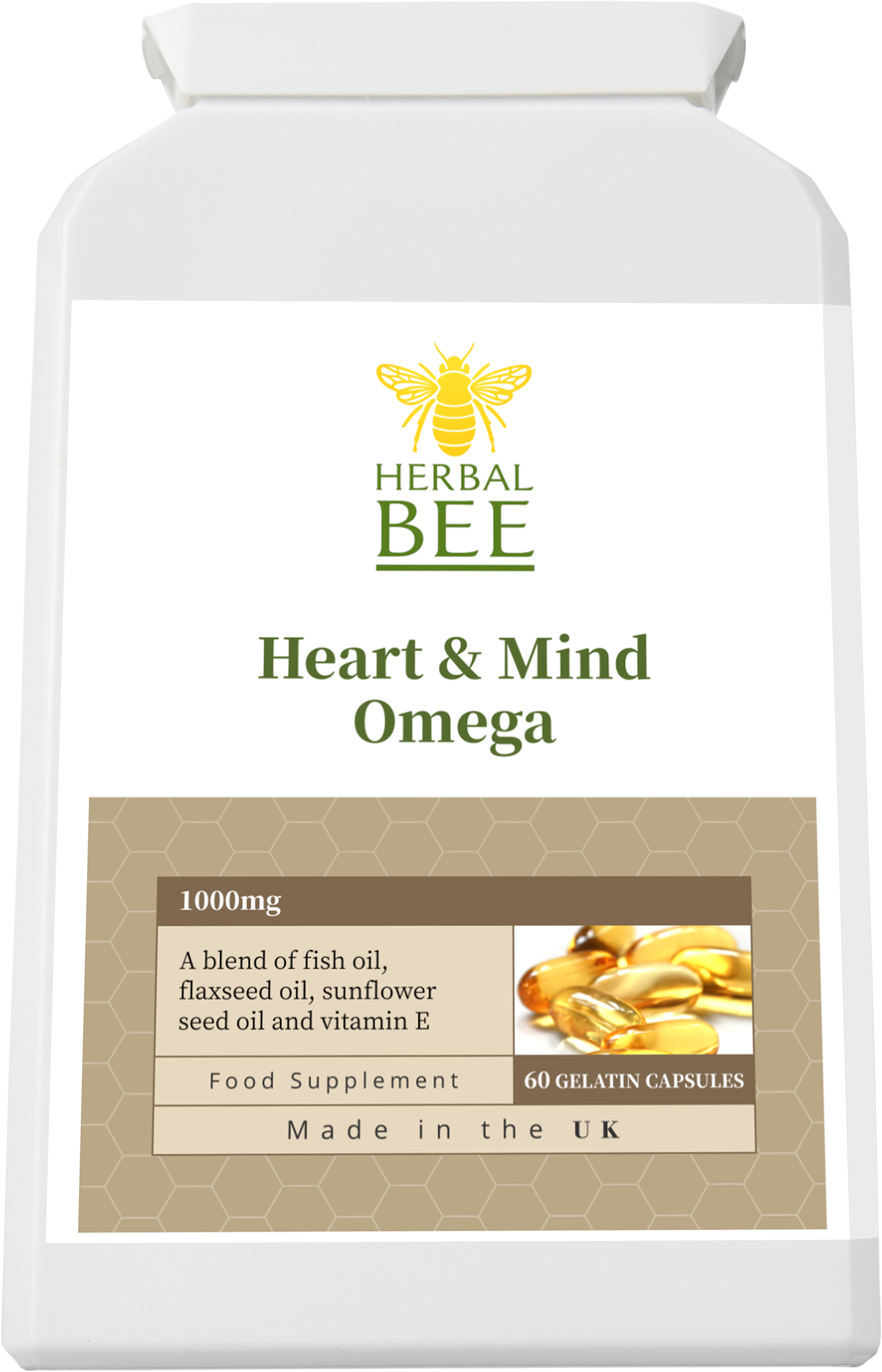 Herbalbee Heart & Mind Omega provides a complete omega 3-6-9 blend from high-quality fish and plant oils. These essential fatty acids are vital for cardiovascular health, brain function, and maintaining healthy joints. Perfect for everyday wellbeing support.